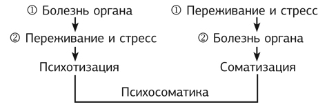 На длинной дистанции голова тоже влияет на тело, а тело на голову. Если голова влияет на тело, это называется соматизация. Если тело влияет на голову, это психотизация. Термин «соматизация» ввел Вильгельм Штекель в 1921 году. Этим термином он обозначил вегетативные расстройства, возникающие у пациентов с неврозами. То есть изначально неврологическая или психологическая проблема приводит к появлению заболевания внутренних органов. В дальнейшем у понятия появилось немало других трактовок. Например, некоторые авторы считают соматизацию – одним из вариантов приспособления, когда человек получает больше выгод в виде заботы окружающих при наличии соматического заболевания, чем психического расстройства.