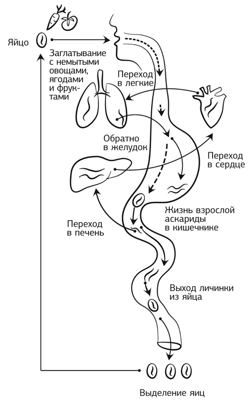 Аскариды живут в тонкой кишке. Какая, человек выделяет яйца в окружающую среду. Если он какает в унитаз – никаких проблем нет. Если же захотелось покакать в огороде, это угроза тем, кто впоследствии будет с него питаться. В почве яйца созревают до инвазивной стадии. Затем человек кушает капусту, клубнику и помидоры. Если они плохо вымыты, яйца попадают в тонкую кишку. Там вылупляются личинки. Они прогрызают стенку кишки и попадают в кровь. К 5 дню после поедания клубники личинки оседают в печени, к 10 дню они пробираются в легкие. Человек начинает кашлять. Он откашливает личинки и одновременно проглатывает их. К 15 дню после вторжения личинки снова попадают в тонкую кишку, дважды линяют и становятся половозрелыми червяками. Продолжительность жизни аскарид составляет около 1 года, а первое потомство черви дают уже через 3 месяца после употребления клубники. Самка откладывает до 200 тысяч яиц. Причем для этого ей даже не всегда нужен самец, а бывает, что и вообще не нужен. Но и от этих червей можно избавиться.