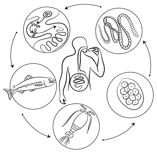 Человек какает в воду. В неё попадают яйца. Через несколько дней из яиц вылупляются личинки, которые называются корацидии. Они покрыты ресничками с крючками. Мелкие рачки циклопы, диаптомусы или дафнии кушают корацидии. В кишечнике рачков они превращаются в другие личинки – процеркоиды. Рачков кушают рыбы. Личинки попадают в кишечник, а оттуда – в мышцы и половые органы. Там процеркоиды превращаются в плероцеркоиды. Иногда рыбы могут быть съедены другими рыбами, например щуками. Они считаются резервуарными хозяевами. Это не обязательный, а дополнительный этап жизненного цикла. У щуки личинки тоже обитают в мышцах. Человек кушает мышцы рыбы (мясо) или икру, зараженную плероцеркоидами. Если продукт не прошел достаточной термической обработки, происходит инвазия (заражение).