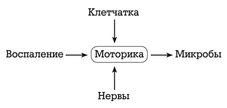 Маятникообразные движения. Возьмите длинный носок за два конца и дёргайте в стороны много раз, растягивая его. Если внутри носка что-то есть, это что-то будет раскачиваться, как маятник. Точно так же поступает и кишечник: он расширяется и укорачивается, а затем удлиняется и сужается. Частота этих движений отличается в разных отделах кишечника. В среднем двенадцатиперстная кишка «раскачивается» со скоростью 12 циклов в минуту, тощая кишка – 10 циклов в минуту, подвздошная – 7 циклов в минуту.