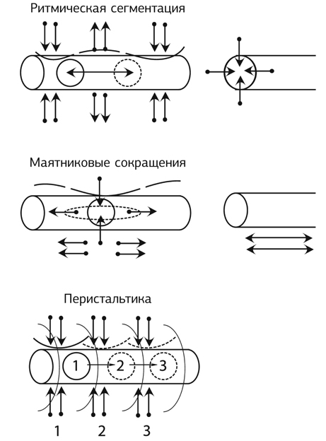 Ритмическая сегментация. Кишечник сжимается то на одном участке (сегменте) длиной 1–2 см, то на другом. Еда перемещается туда-сюда. Движение обеспечивается кольцевидными мышцами. С их помощью кишечник перетирает пищу между стенками. Эти движения происходят в ритме 8–10 раз в минуту.