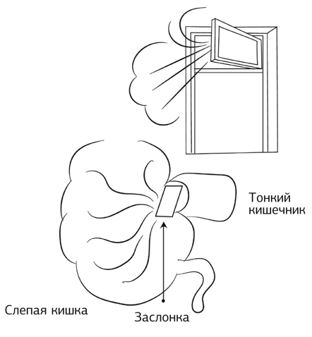 У клапана характер хуже, чем у бабки – вахтерши на входе в общежитие. Баугиниева заслонка соглашается открыться только при наличии нескольких условий. Первое – наличие пропульсивной волны перистальтики. Второе – наличие большого количества содержимого в конечном отделе тонкой кишки. Третье – пустой начальный отдел толстой кишки. За выполнением второго и третьего условий следят механические рецепторы. Они реагируют на растяжение стенки кишечника спереди и сзади заслонки. Если все эти условия соблюдены, клапан соглашается открыться и пропускает содержимое со скоростью 15 мл в минуту. Всего через него проходит около 1,5 литра за сутки.