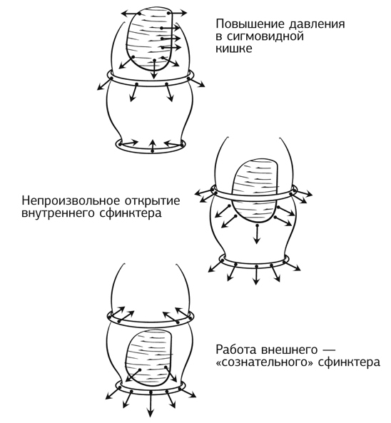 Кал накапливается в сигмовидной кишке. Прямая кишка всегда стоит пустой, а её сфинктеры пребывают в тонусе (напряжены). Позывы возникают, когда увеличивается частота сильных сокращений кишечника. Сигмовидная кишка начинает сокращаться, и давление в прямой кишке повышается. Сфинктеры, которые раньше были в тонусе, теперь расслабляются.