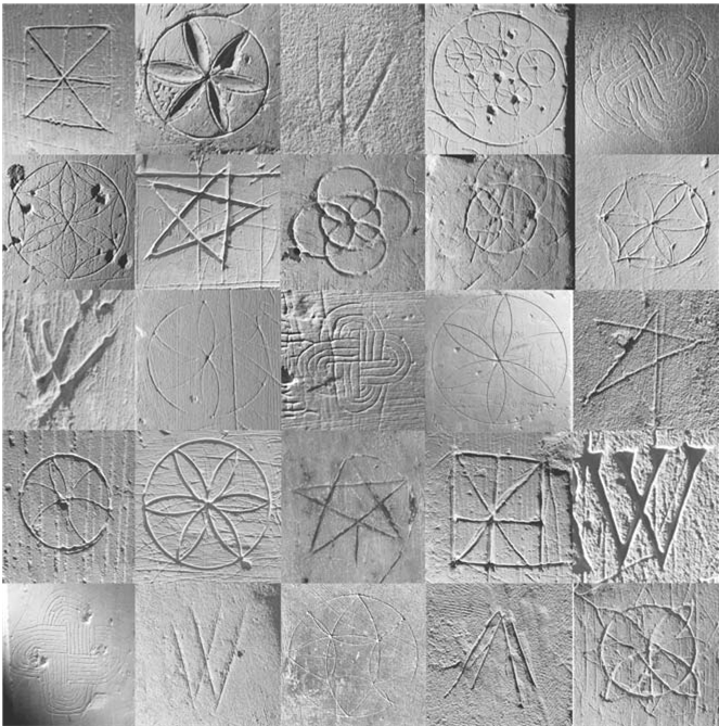 Простейший из этих знаков – один круг, но многие из них представляют собой ромашки (также известные как шестигранники) с сегментами круглых линий, которые образуют шесть лепестков (рис. 9.6). Далее знаки создаются двумя перекрывающимися символами V, иногда перевернутыми, чтобы сформировать фигуру в форме буквы «М». Существуют также так называемые «мерелы» – квадраты или прямоугольники с линиями, проведенными из каждого угла, пересекающимися посередине. Реже встречаются свастики, сложные узловые конструкции (так называемые Соломоновы узлы) и пятиконечная звезда, известная как пятиугольник. Маргаритки, возможно, происходят из римского мира. Их находили на римских фортах в Британии, где назначение маргариток могло быть совершенно иным. Без сомнений, с XI по XV век они распространены в церквях. Трудно сказать, группируются ли знаки в определенных областях внутри церквей. Защитные знаки, вероятно, были сделаны на камне, дереве и штукатурке, но ранняя штукатурка либо не сохранилась, либо была оштукатурена или закрашена позже. Там, где можно различить более широкий узор, концентрации вокруг шрифта являются всеобщими. Суоннингтонская церковь в Норфолке имеет множество форм надписей на стенах, включая надписи и геометрические узоры. Многие из последних группируются вокруг исходного положения шрифта, и подобные распределения наблюдаются в других восточноанглийских церквях. Геометрические знаки часто описываются как нарисованные циркулем, но возможно, учитывая их повсеместное распространение, они были сделаны каким-то общим инструментом, таким как ножницы с двумя лезвиями, соединенными металлической петлей. Одно лезвие могло быть помещено в точку, а другое использовалось для описания части или всего круга. Ножницы были обычными предметами домашнего обихода и часто ассоциировались с женщинами на картинах или в погребениях. Интерьер средневековой церкви сильно отличался по внешнему виду от интерьера современных церквей. При внимательном осмотре стен видно, что их нижние участки были покрыты яркими красными, черными или желтыми пятнами с нарисованными изображениями святых или эпизодами из жизни Христа. Надписи на стенах церкви сегодня трудно разглядеть на белом фоне, но многие шестигранники и другие знаки были начертаны через окрашенную штукатурку вплоть до камня, который выделялся на цветном фоне. Тело средневековой церкви было открытым, публичным пространством, возможно, с купелью, разделяющей неф, который использовался не только для богослужений, но и для ряда других общественных мероприятий. Только с конца XVI века поперек церкви были установлены скамьи или добавлены кресты. В этом пространстве в течение пяти веков или более люди наносили рисунки на стенах церкви, где они были бы видны всем. Некоторое время после этого авторство и точное назначение знаков вполне могли быть известны. Более могучая сила и магия церкви мобилизовались через эти знаки, придавали им дополнительную эффективность и защитную силу. Хотя это и не было частью официального церковного ритуала (и бо́льшая часть латинского богослужения в любом случае была непонятна большинству), создание таких знаков являлось общепринятым и признанным элементом церковного использования и влияния, практикуемым многими.