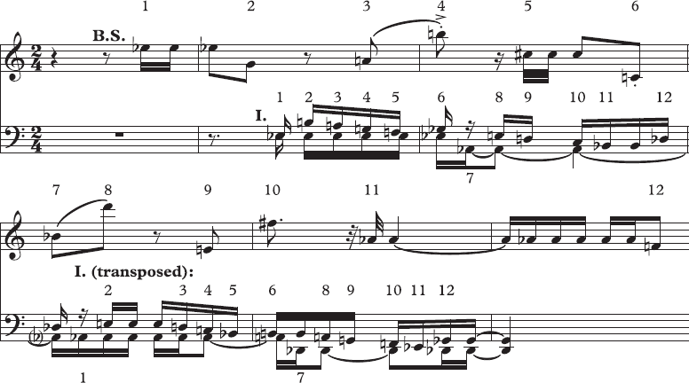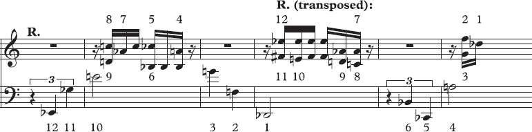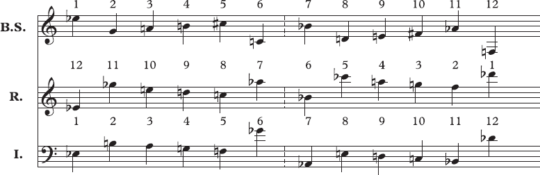 Схематическое описание процедур Шенберга в его Духовом квинтете (1923–1924), одном из первых произведений, полностью написанных в соответствии с «Композицией на основе 12 тонов» (если пользоваться здесь названием эссе самого Шенберга). В начальных тактах представлена основная серия из 12 тонов, пронумерованных от одного до 12; затем их ракоход (12–1) и обращение. Два отрывка из квинтета демонстрируют эти проведения серии, используемые как для создания мелодии, так и построения аккордов, в контексте