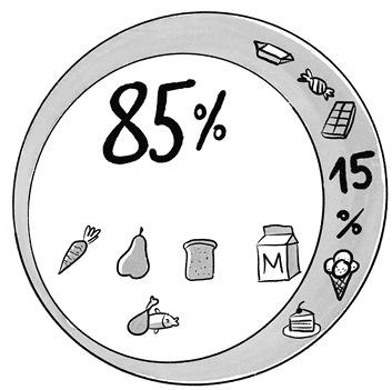 А 15 % – это «дополнительная еда», куда входят продукты с добавленным сахаром, фастфуд и алкогольные напитки.