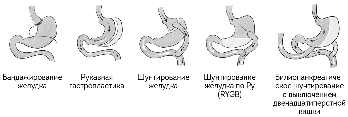 Бариатрическая операция бывает нескольких видов. Современная хирургия успешно применяет следующие виды бариатрических вмешательств: