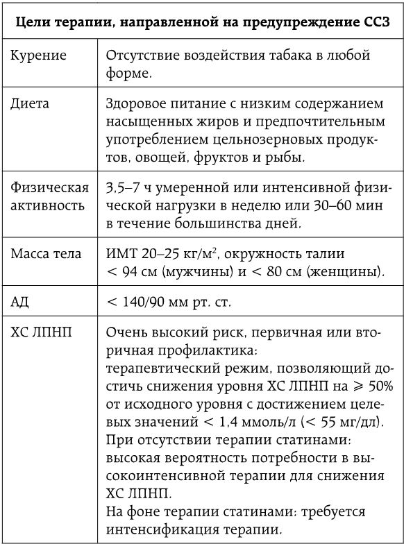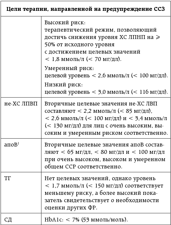Примечание: а – более низкие целевые значения рекомендованы для большинства пациентов с артериальной гипертензией, получающих антигипертензивную терапию, при условии ее хорошей переносимости, b – термин «исходный» относится к уровню ХС ЛПНП у пациента, не получающего терапию, направленную на снижение ХС ЛПНП. У лиц, которые получают такую терапию, потенциальный исходный (до начала лечения) уровень ХС ЛНП следует установить, основываясь на эффективности конкретного лекарственного препарата или комбинации препаратов.
