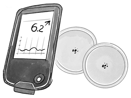 Помимо глюкометров, которые позволяют оценить сахар в крови в конкретный момент времени, существуют системы непрерывного мониторинга глюкозы. С помощью подкожных датчиков (сенсоров) они измеряют сахар в межклеточной жидкости непрерывно, с частотой раз в 5–15 минут.