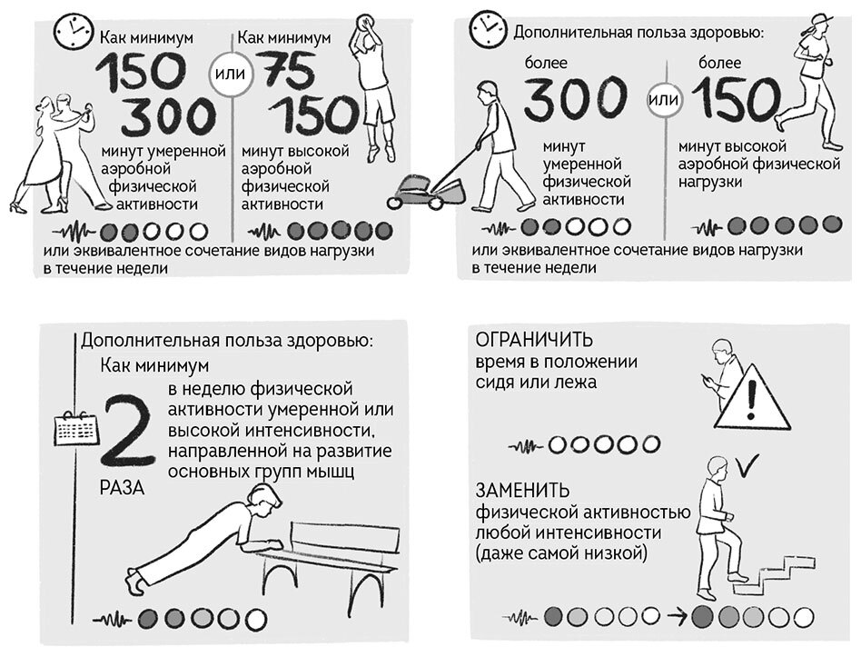 Вне зависимости от вида занятий физической активности человек ежедневно должен уделять не менее 30 минут. ВОЗ рекомендует: