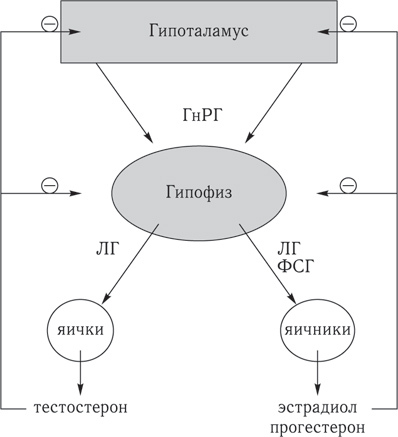Основные половые стероидные гормоны включают эстрогены: эстрон (Е1), эстрадиол (Е2) и эстриол (Е3); гестагены, включая прогестерон; андрогены, наиболее важным среди них является тестостерон, который отвечает за регуляцию репродуктивных органов мужчин, а также за формирование вторичных половых признаков, включая рост костной массы и волос на теле. Тестостерон в основном вырабатывается надпочечниками и мужскими половыми железами из холестерина, и уровень его продукции существенно меняется с возрастом. Выброс половых гормонов регулируется гипоталамо-гипофизарно-гонадной системой. ГнРГ вызывает секрецию лютеинизирующего гормона (ЛГ) и фолликулостимулирующего гормона (ФСГ) в гипофизе, которые стимулируют высвобождение половых гормонов из репродуктивных органов.