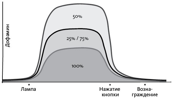 Далее в опыт включили механизм случайностей. Теперь только в 50% случаев за окошком лежало вознаграждение. Лампа горела, обезьяна жала на кнопку, но вознаграждение появлялось не регулярно, а только в половине случаев. Можно было бы предположить, что обезьяна утратила удовольствие от игры, но всё произошло наоборот. Выброс дофамина в мозг примата существенно возрос. Встроенный механизм случайности вызвал новый бум счастья в мозге. Если же вознаграждение выдавалось в 25 или 75% случаев (менее «случайно», чем при 50%), уровень дофамина снова снижался. Чем значительнее «может быть», тем больше очагов счастья возникает в мозге.