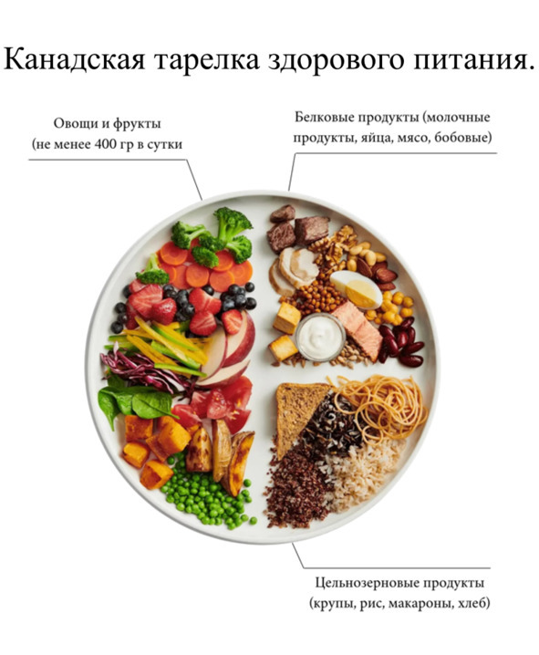 Если вы пока что не понимаете, о чем я, то рассказываю: метод тарелки (или модель, принцип тарелки) – это способ распределить количество нужной еды на вашей тарелке, чтобы прием пищи был сбалансированным по белкам, жирам, углеводам и по пищевым группам. И их самое оптимальное соотношение показано на Канадской тарелке здорового питания: