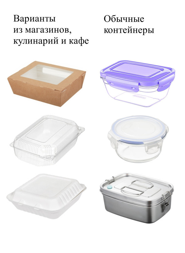 Например, варианты из магазинов, кулинарий и кафе, куда складывают либо готовую еду, либо остатки после приема пищи, которые человек может унести с собой. Или самые распространенные контейнеры, в которых еще мои родители брали еду на работу.