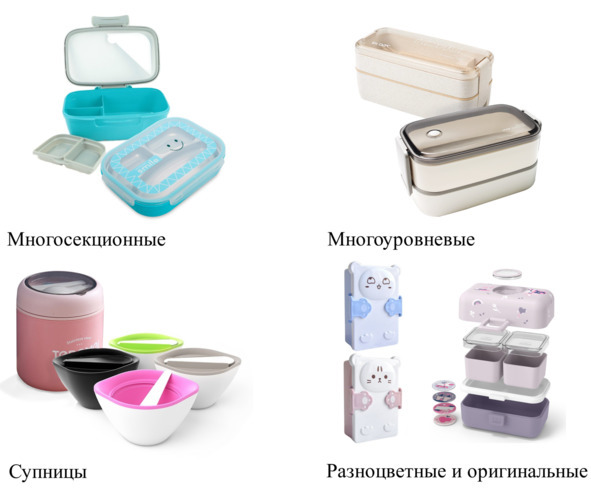 Что еще важно: это самая большая группа по всевозможным видам контейнеров, которые отличаются не только размерами и формами, но и наполнением (отсеки, соусницы, приборы), а также дизайном и цветом. Среди них выделяют: