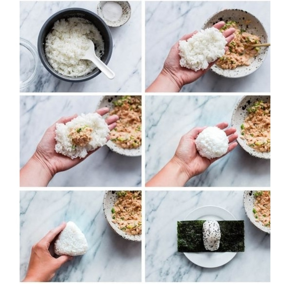 – если вы делаете онигири вручную, то нужно аккуратно слепить рис в треугольник, а в центре сделать углубление, в которое вкладывается начинка;