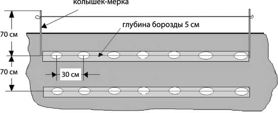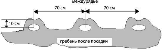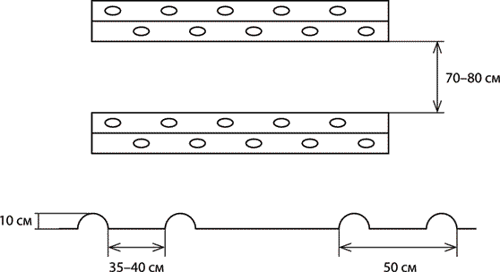 В основе способа принцип посадки гребнем или ровиком, только грядку мы делаем двойную, и гребень у нас получается широкий – 65–70 см.