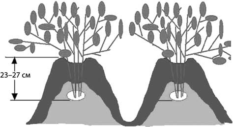 Далее засыпьте землей клубни тяпкой с двух сторон, формируя М-образный гребень высотой 8–10 см и шириной 18–22 см.
