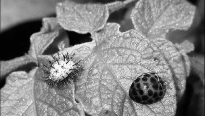 • Первый вылет – в начале или середине июня. В этот период я обязательно осматриваю листву картофеля, и если наблюдаются скопления вредителя, то опрыскиваю картофель. Если не опрыскать, то в конце июня и начале июля картофельная коровка спаривается и откладывает яйца. Затем образуются личинки картофельной коровки (в народе их называют ежики). Эти личинки быстро поглощают листву, обрабатывать их препаратами затруднительно, так как они расположены на нижней части листа.