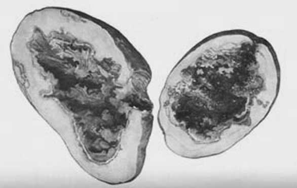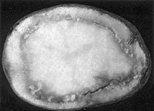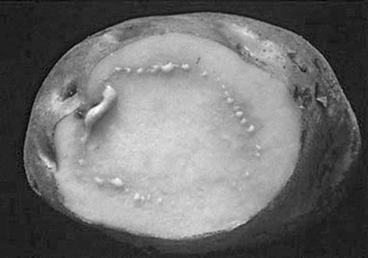 На клубне болезнь обнаруживается при продольном разрезе. Сосудистое кольцо мягкое и имеет желтоватую окраску. При сдавливании срезанной половины клубня из пораженных сосудов выступает светло-желтая масса, представляющая собой разрушенные клетки вместе с бактериями. Позже поражение может распространиться на соседние ткани, включая и сердцевину. Вся внутренняя часть клубня выгнивает и превращается в тягучую, неприятно пахнущую массу. Заражение клубней бактериями происходит главным образом еще в поле, на ранних стадиях клубнеобразования. В этом случае бактерии из сосудов больного куста через столоны проникают в сосудистую систему клубней нового урожая. Второй путь заражения – в период уборки, когда инфекция попадает непосредственно на кожуру клубня при прямом контакте с разрезанной больной ботвой или разрезанными больными клубнями. В этом случае на клубнях в период хранения развивается ямчатая форма кольцевой гнили. На очищенной от кожуры поверхности заметны округлые маслянистые желтые пятна размером 2–3 мм. Они постепенно увеличиваются до 1–1,5 см в диаметре.