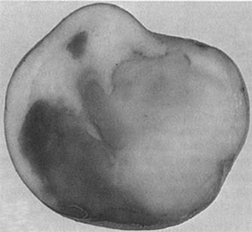 На пораженных клубнях симптомы заболевания проявляются в виде темной гнили, начинающейся, как правило, в столонной части. Проникая из стеблей через столоны в дочерние клубни, бактерии распространяются до середины и превращают ее в мягкую гниющую массу. Окраска пораженных частей клубня вначале светлая, потом темнеет.