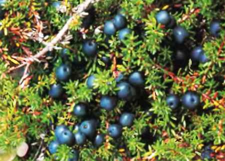 Признаки. Низкостелющийся, густо разветвленный кустарник, высотой до 50 см Игловидные блестящие листья длиной 4–6 мм имеют с нижней стороны белую бороздку. Плоды — блестящие округлые ягоды черного цвета, размером с горошину, расположенные по одной в пазухах листьев. Они содержат множество мелких косточек, красный сок и имеют кислый вкус.