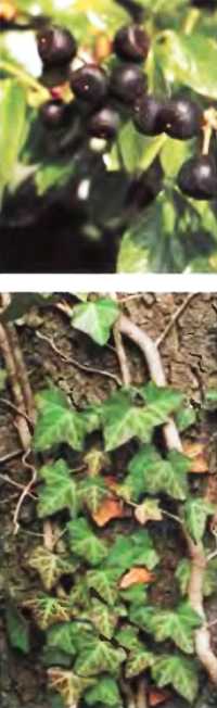 Плющ вверху плоды и овальные листья, внизу вьющийся побег с лопастными листьями. Все части растения ядовиты.