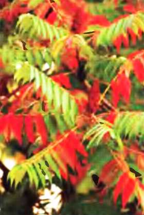Первые осенне-красные листья уксусного дерева