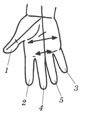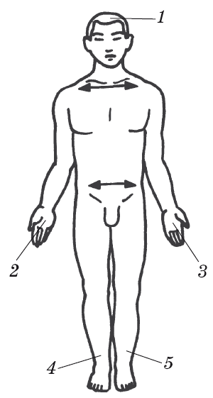 Рис. 57. Соответствие частей тела пальцам кисти: 1 – голова и большой палец, 2 – правая рука и указательный палец, 3 – левая рука и мизинец, 4 – правая нога и средний палец, 5 – левая нога и безымянный палец