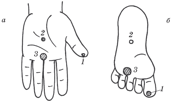 Рис. 65. Инь-проекция гипофиза, пупка и половых органов: а) на ладонь, б) на подошвенную часть стопы; 1 – гипофиз, 2 – пупок, 3 – половые органы