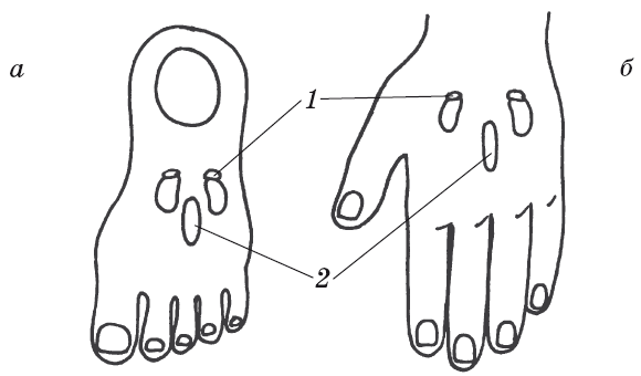 Рис. 66. Ян-проекция поясницы, почек и надпочечников: а) на верхнюю часть стопы, б) на тыльную часть кисти; 1 – почки и надпочечники, 2 – поясни