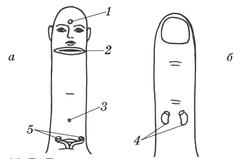 Рис. 68. БАТ и рефлексогенные зоны пальцев для сохранения молодости и красоты: а) проекция гипофиза, шеи и половых желез на ладонную поверхность пальца кисти, б) проекция почек и надпочечников на тыльную поверхность пальца кисти; 1 – гипофиз, 2 – шея, 3 – пупок, 4 – почки, 5 – яичники