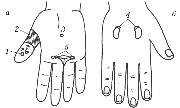 Рис. 69. Проекция гипофиза, шеи, пупка и половых желез на кисть; 1 – гипофиз, 2 – шея, 3 – пупок, 4 – почки, 5 – яичники