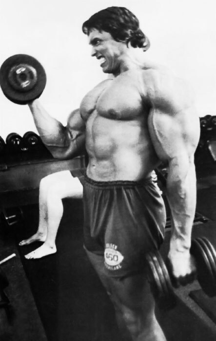 Выполнение: (1) в положении сидя или стоя возьмите гантели в каждую руку и опустите руки вдоль туловища. (2) Согните руки с гантелями в локтях, но остановитесь на полпути вверх, когда ваши предплечья будут примерно параллельны полу, затем вернитесь в исходное положение. Сделайте 7 повторений этого движения. Затем, без остановки, (3) согните руки с гантелями до конца, но остановитесь на полпути вниз и сделайте 7 повторений этого движения. Далее, несмотря на усталость, закончите упражнение серией из 7 полных сгибаний рук с гантелями. Мне нравится выполнять это упражнение перед зеркалом, где я могу следить за руками, поднимая и опуская их на нужную высоту.