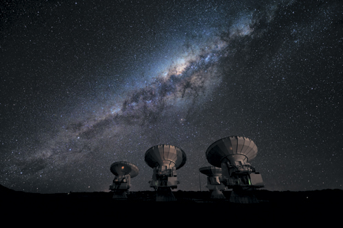 Сверкающая лента Млечного Пути сияет над плато Чахнантор в чилийской пустыне Атакама, ставшей домом для комплекса радиотелескопов «Атакамская большая [антенная] решетка миллиметрового диапазона». Наш мир – часть огромного скопления звезд, нашего космического дома. Его можно увидеть на снимке с длинной выдержкой, которая дает превосходное изображение центра Галактики, плотно населенного звездами. Темные пятна вдоль светлой полосы выдают присутствие межзвездной пыли: она блокирует свет звезд, находящихся за ней