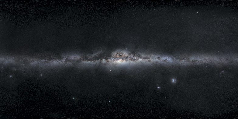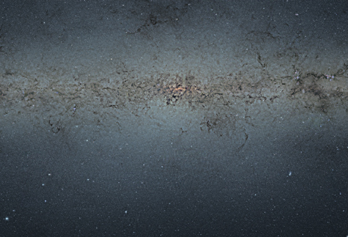 Панорамный снимок Млечного Пути в видимом свете, на котором ясно различается галактический диск и яркий, но частично затененный межзвездной пылью балдж. Наша Галактика относится к большим спиральным галактикам с перемычкой – структурой, присоединяющей спиральные рукава к ядру
