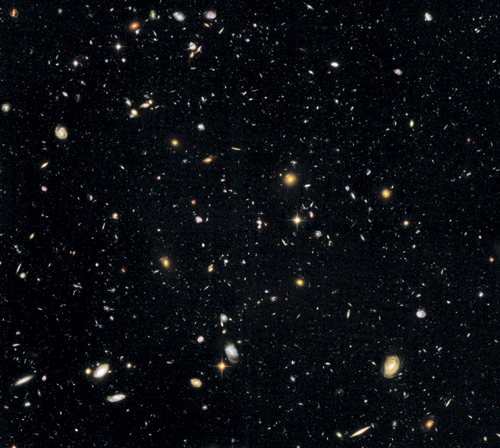«Сверхглубокое поле “Хаббла”» – «окно» в очень далекие регионы Вселенной. Почти каждая световая точка на этом снимке – это галактика, открытая, когда телескоп «Хаббл» снимал небольшие участки космоса (около 10 % диаметра полной Луны) с очень длинной выдержкой. Здесь можно различить детали этих относительно близких к нам, но все же очень далеких галактик, среди которых ясно выделяются спиральные и эллиптические. Однако определить формы и размеры самых дальних из них практически невозможно: на снимке это светлые и красные точки размером всего в несколько пикселей. Тем не менее обнаружение этих галактик крайне важно для науки, так как оно позволит узнать больше о том, какими были галактики в эпоху ранней юности Вселенной. Свет от самых дальних галактик, изображенных на снимке, возник, когда Вселенной было всего полмиллиарда лет. Через эту фотографию мы смотрим в прошлое