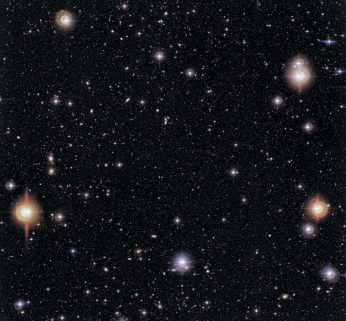 «Глубокое поле "Чандры" – Юг» (англ. Chandra Deep Field South) – это внегалактическое исследование одного из регионов глубокого космоса – «пустого поля», значительный вклад в которое внесло множество разных телескопов. Целью проекта был поиск для наблюдения части неба, где отсутствовали бы известные объекты всеобщего интереса (скажем, большая соседняя галактика), чтобы астрономы могли проводить непредвзятое слепое исследование большого количества галактик, видимых на разных стадиях красного смещения, то есть на разных этапах космических эпох. Это оптическое изображение размером с полную Луну, а время выдержки при его съемке составляет два дня. Наблюдая за нашей Галактикой, мы видим лишь бесконечную череду звезд, но за ее пределами – мириады галактик, и наш мир – лишь один из множества