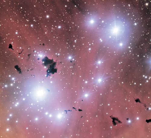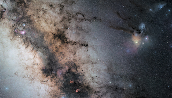 Это увеличенное изображение центральной части Млечного Пути, на заднем плане которого ясно видно затемнение звездного пространства межзвездной пылью, сгущающейся на плоскости диска. Местами мы можем увидеть пятна диффузного излучения: синего цвета – от свечения молодых звезд, рассеянного и отраженного частицами газа и пыли, и красно-розового – от свечения ионизированного водорода (HII) в местах зарождения новых звезд