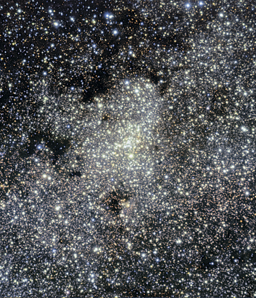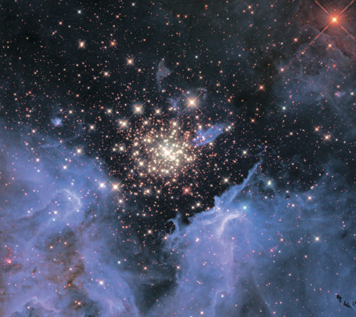 Не все звездные скопления глобулярные. Изображенный на снимке открытый звездный кластер в нашей Галактике называется NGC 3603. На дисках галактик, подобных нашей, звезды рождаются в гигантских облаках молекулярного газа, которые в процессе гравитационного коллапса могут породить сразу множество звезд, что приводит к возникновению подобных кластеров (хотя не все звезды рождаются скоплениями). Вокруг скопления можно заметить свечение от межзвездного газа (его испускают элементы водорода, серы и железа), заряженного радиацией, которую излучают молодые массивные звезды. Детальное понимание физических процессов звездообразования, основанное на изучении регионов активного звездного роста в нашей Галактике, дает нам жизненно важные данные для понимания процесса развития звездообразующих галактик дальней (и ранней) Вселенной