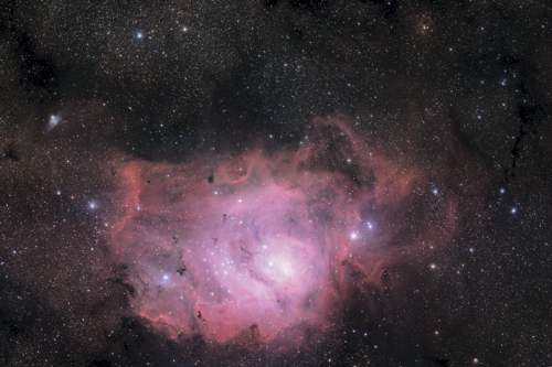 Туманность Лагуна – это гигантское межзвездное облако и область HII в нашей Галактике. Ее красный цвет говорит о свечении ионизированного водорода, а темные пятна вокруг выдают присутствие большого и плотного газопылевого облака. На снимке изображен регион, который в восемь раз больше размера Луны на небе. Изучая диски близлежащих звездообразующих галактик, мы нередко видим их спиральные рукава, обильно приправленные такими HII-областями, как эта