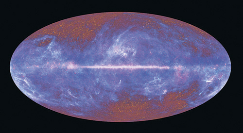 Фотография Млечного Пути, сделанная космической обсерваторией «Планк». Целью проекта «Планк» было изучение изменения космического микроволнового фона – реликтового излучения, но поскольку эта космическая обсерватория наблюдала за всем небом, она также снабжала нас детальными изображениями Млечного Пути. Этот снимок показывает в белых оттенках тонкую эмиссию пыли в нашей Галактике, в основном сосредоточенную на галактическом диске, и обнаруживает сложную морфологию пространства над и под ним (на высоких галактических широтах). Бо́льшая часть галактик содержит значительное количество пыли, образовавшейся во время формирования звезд. Эта пыль поглощает ультрафиолетовый и оптический свет, но испускает излучение в инфракрасном диапазоне спектра по мере нагревания в поле межзвездного излучения