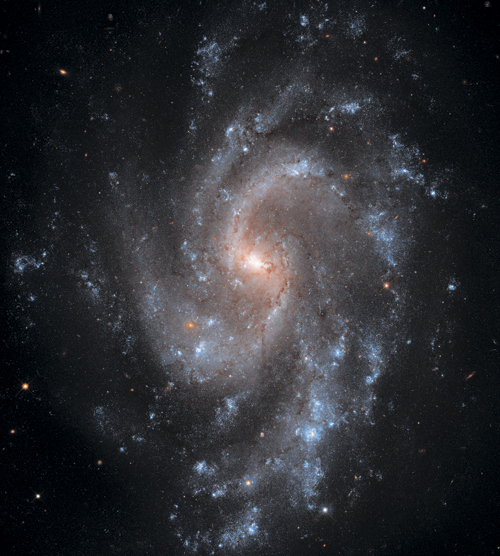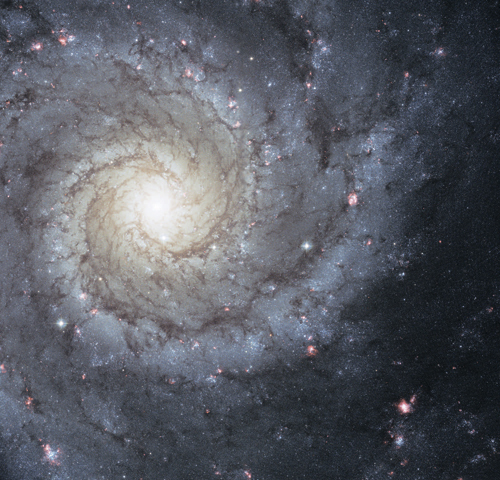 Изображение галактики M74 со структурой типа гранд-дизайн представляет захватывающий вид на самые разные элементы, составляющие эту спиральную галактику, расположенную исключительно удобно для наблюдений с Земли. Яркое светло-желто-оранжевое ядро сияет светом миллиардов звезд – в среднем они старше, чем синие (и более молодые) звезды, которые видны сквозь галактический диск. Пятна красного цвета, напоминающие всполохи лесных пожаров на аэрофотосъемке, показывают области HII, где формирующиеся в гигантских облаках молекулярного газа звезды ионизируют водород – точно так же, как это происходит в нашей Галактике. Сквозь диск и спиральные рукава тянутся кружева межзвездной пыли, словно темный автограф из пепла давно погибших звезд