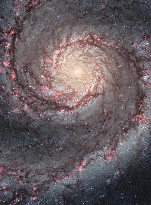 Сердце галактики Водоворот – еще одной прекрасной спиральной галактики, которая также хорошо видна с Земли. Снимок показывает сложную структуру этих «островов Вселенной». Два спиральных рукава, отходящих от ядра, отличаются особенной яркостью из-за присутствия в них областей ионизированного водорода и густых слоев пыли. Обратите внимание на взаимосвязь расположения участков пыли и мест активного формирования звезд
