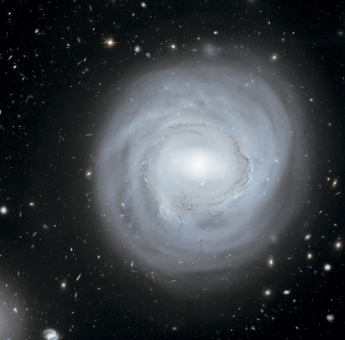 Эффектный вид на спиральную галактику NGC 4921, которая входит в скопление галактик Волосы Вероники, или скопление Кома. Рукава этой галактики не так ярко выражены, как у других ее спиральных «коллег» вроде галактики Водоворот, – возможно, в силу того, что NGC 4921 не так интенсивно производит звезды в своем диске. Это может быть связано и с плотностью межзвездного скопления: часть газа, который необходим для образования звезд, была захвачена во время прохождения галактики через плотную раскаленную межгалактическую среду. Фон снимка обнаруживает несчетное количество дальних галактик самых разных типов: они кажутся гораздо меньше и бледнее, чем NGC 4921
