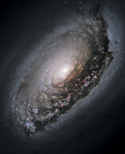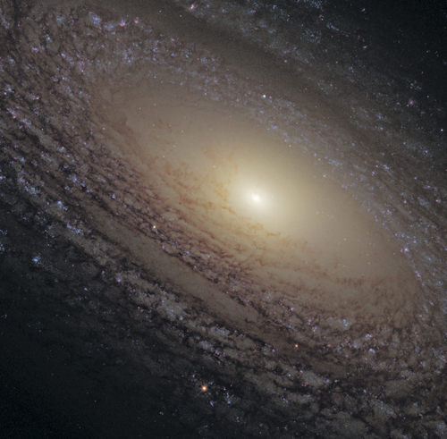 Центральный регион спиральной галактики NGC 2841, чье яркое гладкое желто-оранжевое ядро красиво контрастирует с извилистыми спиральными рукавами, покрытыми «татуировками» из пыли и испещренными здесь и там синими кластерами новых звезд. Как наблюдатели, мы прикованы к точке внутри диска схожей с NGC 2841. Галактики, откуда смотрим сквозь звезды, газ и пыль на Вселенную, простирающуюся за пределами нашего места обитания