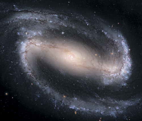 NGC 1300 – спиральная галактика с перемычкой. Яркие спиральные ветви, начинающиеся на концах линейной структуры перемычки, светятся из-за присутствия в них молодых горячих синих звезд и областей звездообразования, центральная часть которых заметно краснее, а значит, звездная популяция здесь в среднем более зрелая. В самом центре галактики видна еще одна спиральная структура, представляющая собой активное ядро галактики с газом и звездами, где также происходит процесс формирования звезд. Структура с перемычкой отчасти отвечает за движение газа и звезд от диска к центру галактики, поскольку она перераспределяет момент импульса. В некоторых галактиках перемычка важна и при формировании балджей