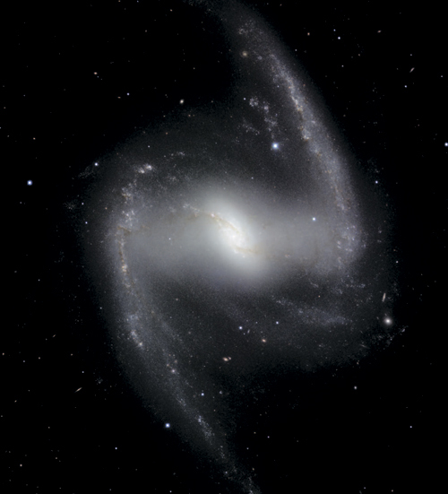 Снимок, сделанный в ближнем инфракрасном диапазоне, показывает спиральную галактику с перемычкой NGC 1365. Формирование перемычки происходит в результате гравитационных возмущений в общем вращении галактического диска, что приводит к удлинению орбит некоторых звезд, за счет чего формируется перемычка. Около двух третей спиральных галактик, известных нам сегодня, содержат перемычки – в том числе и наша