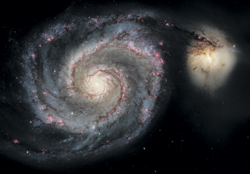 Более масштабный вид на галактику Водоворот (М51). Большая спиральная галактика взаимодействует с маленькой и неправильной, которую можно увидеть на конце одного из спиральных рукавов. Гравитационное воздействие этого маленького компаньона, который, что вполне возможно, прошел через диск М51, повлияло на спиральный рукав большой галактики. Его очертания очень хорошо видны на этом снимке и сияют из-за света новых звезд и областей HII
