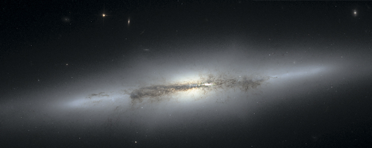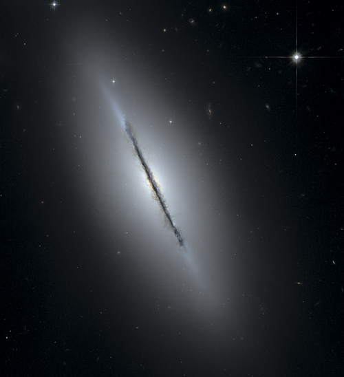 На этом снимке, полученном при помощи телескопа «Хаббл», видна линзовидная галактика Веретено. Удлиненная полоса белого сияния возникает благодаря свету миллиардов звезд, бо́льшая часть которых расположена в балдже, доминирующем в этой галактике. Мощные пылевые полосы на центральной плоскости диска практически полностью затемняют свечение позади себя. Линзовидные галактики обычно пассивны – в них больше не рождаются новые звезды, – так что пыль возникла в более ранний период существования галактики, когда здесь еще шел активный процесс формирования звезд. Таким образом, эта пылевая завеса дает нам ключи к минувшим этапам эволюции Веретена. Процесс формирования линзовидных галактик пока еще не до конца понят, но существует вероятность, что они образовались из массивных спиральных галактик определенного типа